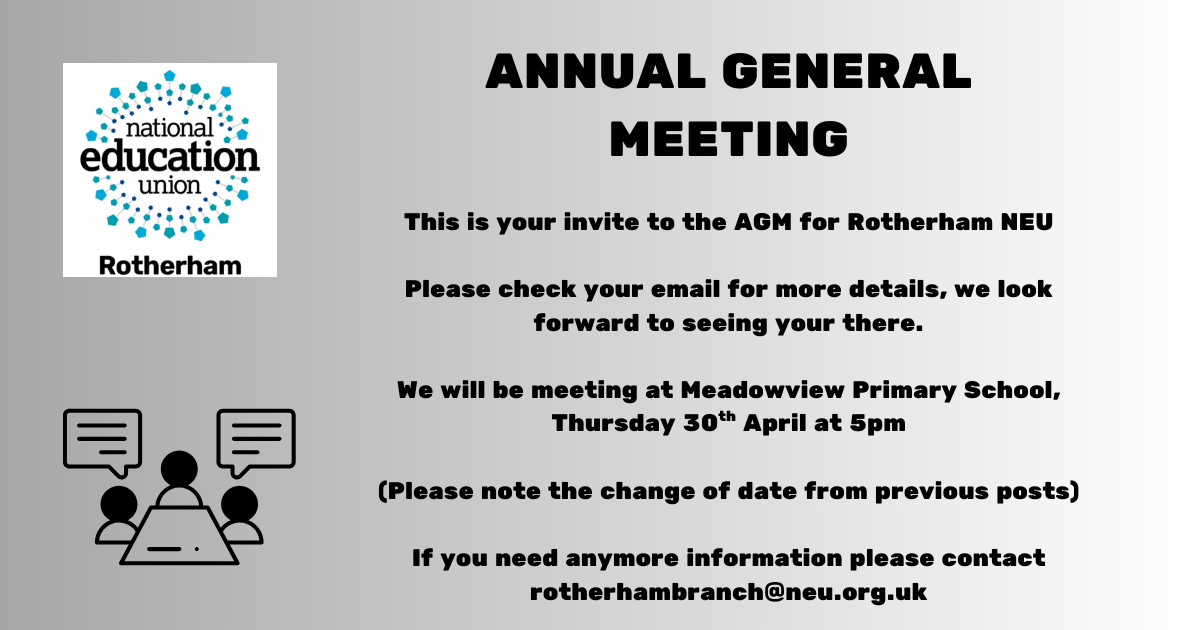 A change of date for the Rotherham NEU AGM – we will now meet on Thursday 30th April – check out our social media posts for more details.